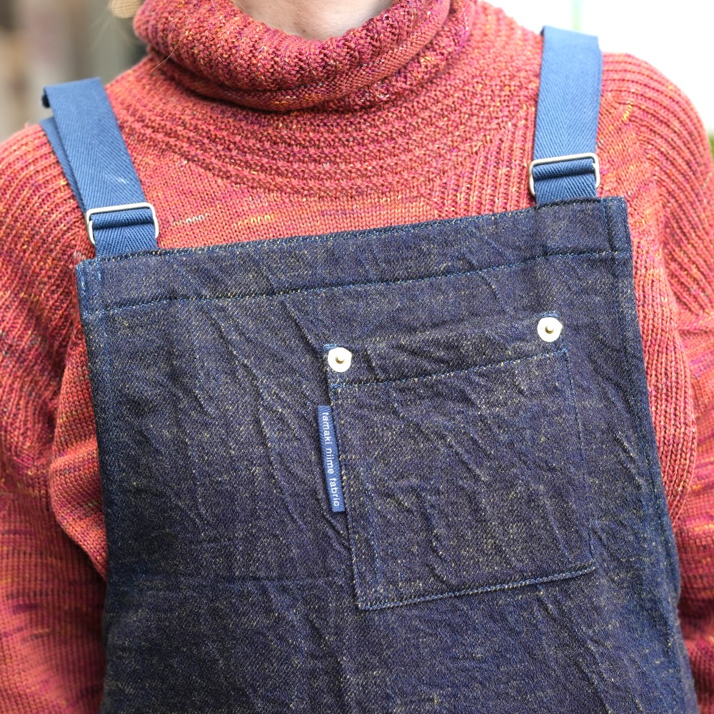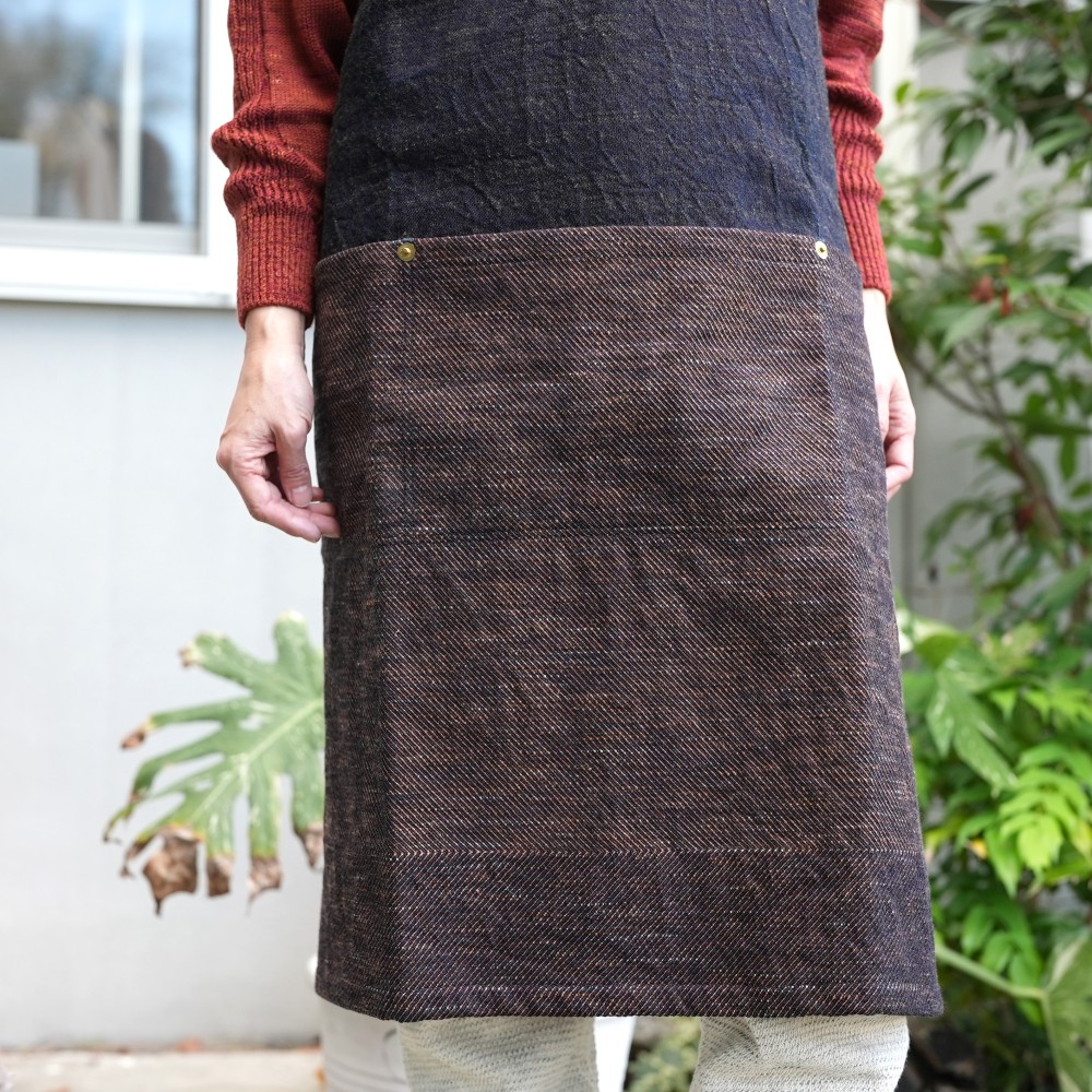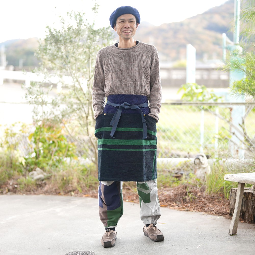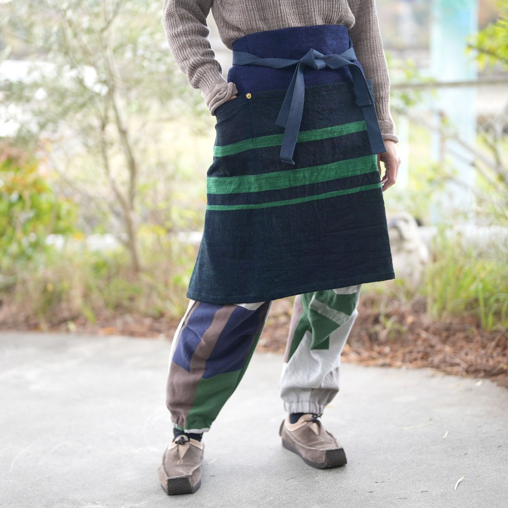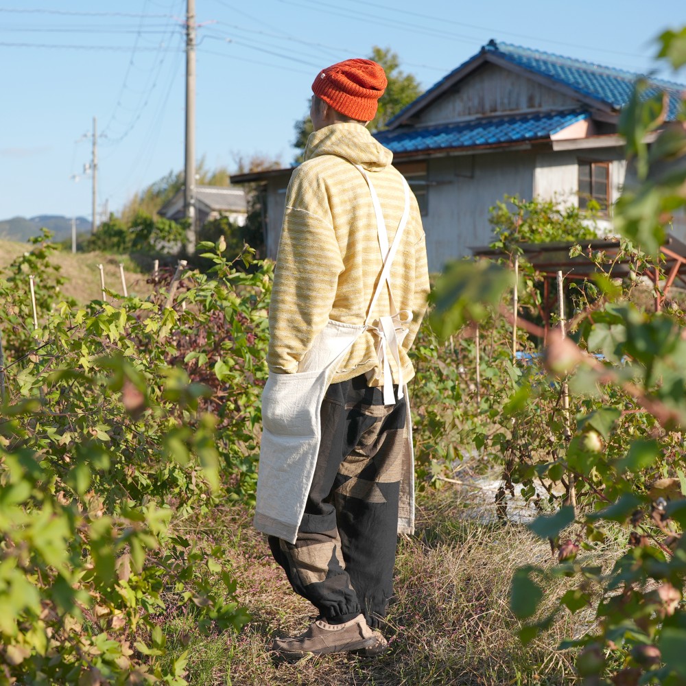 Seeing the clothes of the Lab staff were getting dirty by our creations, we thought it would be more fun to wear an apron and let it change over time! That's how "maeka" was created. Aprons reflect the histories of the wearers and the lives they lead. Denim, with its durability and ability to age and mold to the body over time, is the perfect match. It has three pockets and the top half can be folded down to become a waist apron.