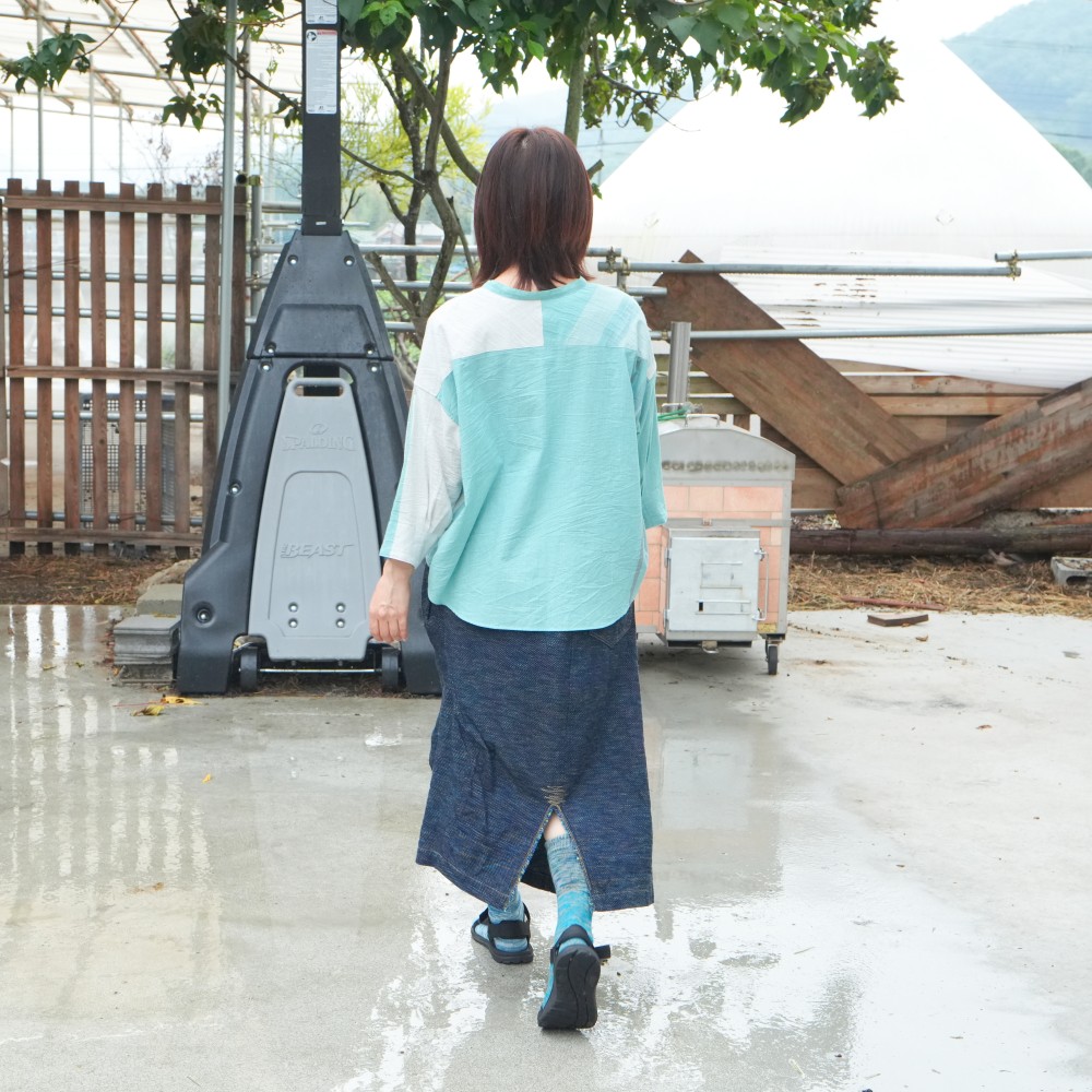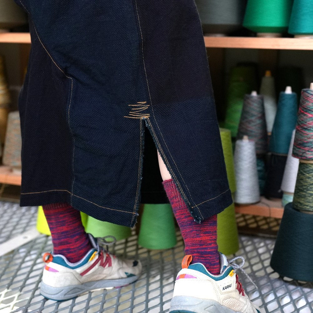 これまでつくりあげてきたデニムの中でも群を抜いて、やわらか。綾織をベースに、色が主役になるように緯糸を表地にがっつりと出しきれいに見える形、大きさ、配置を追及しました。刺し子のような、手仕事感のある色が主役の、デニム。