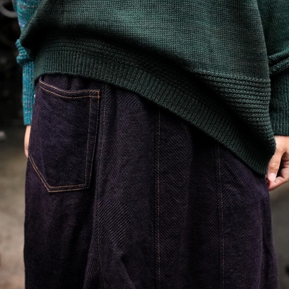 tamaki niimeらしく手をかけてヘリンボーンを不規則に織った あたらしいデニム生地、乱。履き込んでいくことでくっきりと柄が出て、 だんだんと風合いが変わります。 deniimeが好きな人、オンリーワンを手にしたい人、 はじめての人も“ふつうだけどちょっと違う”を楽しんで。