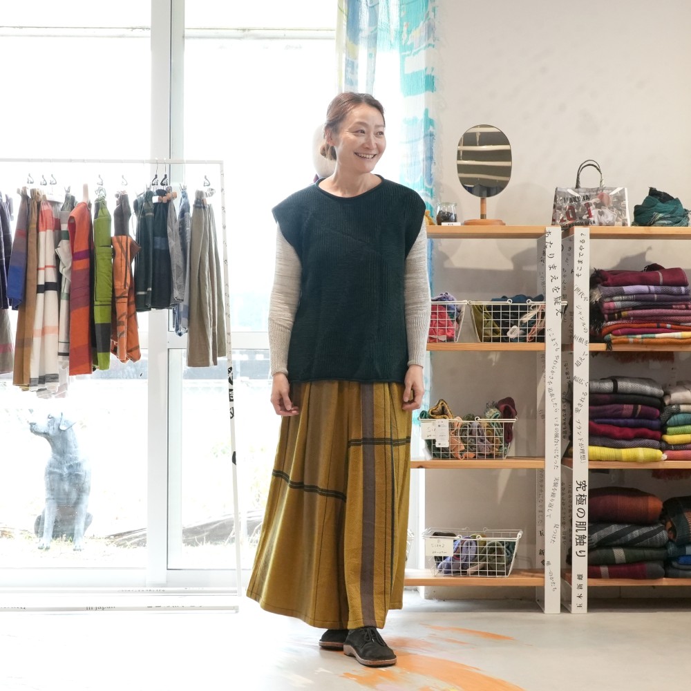It’s a wide pants that using the textile of tamaki niime simply and luxuriously.