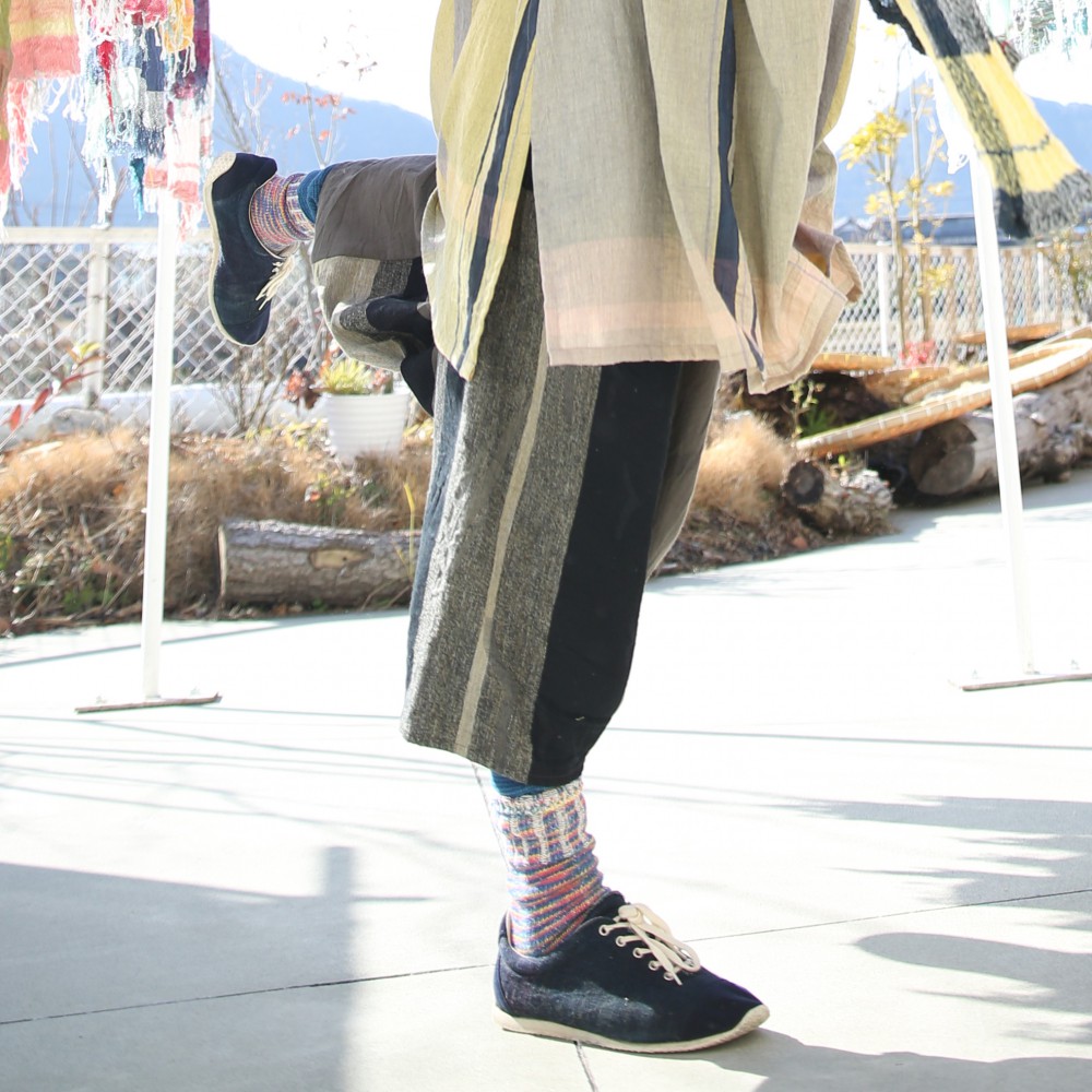 We created  "new but unchanging" sneakers with  tamaki niime’s denim fabric and the blue over’s original pattern.