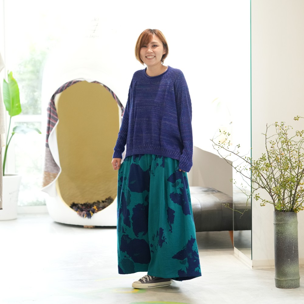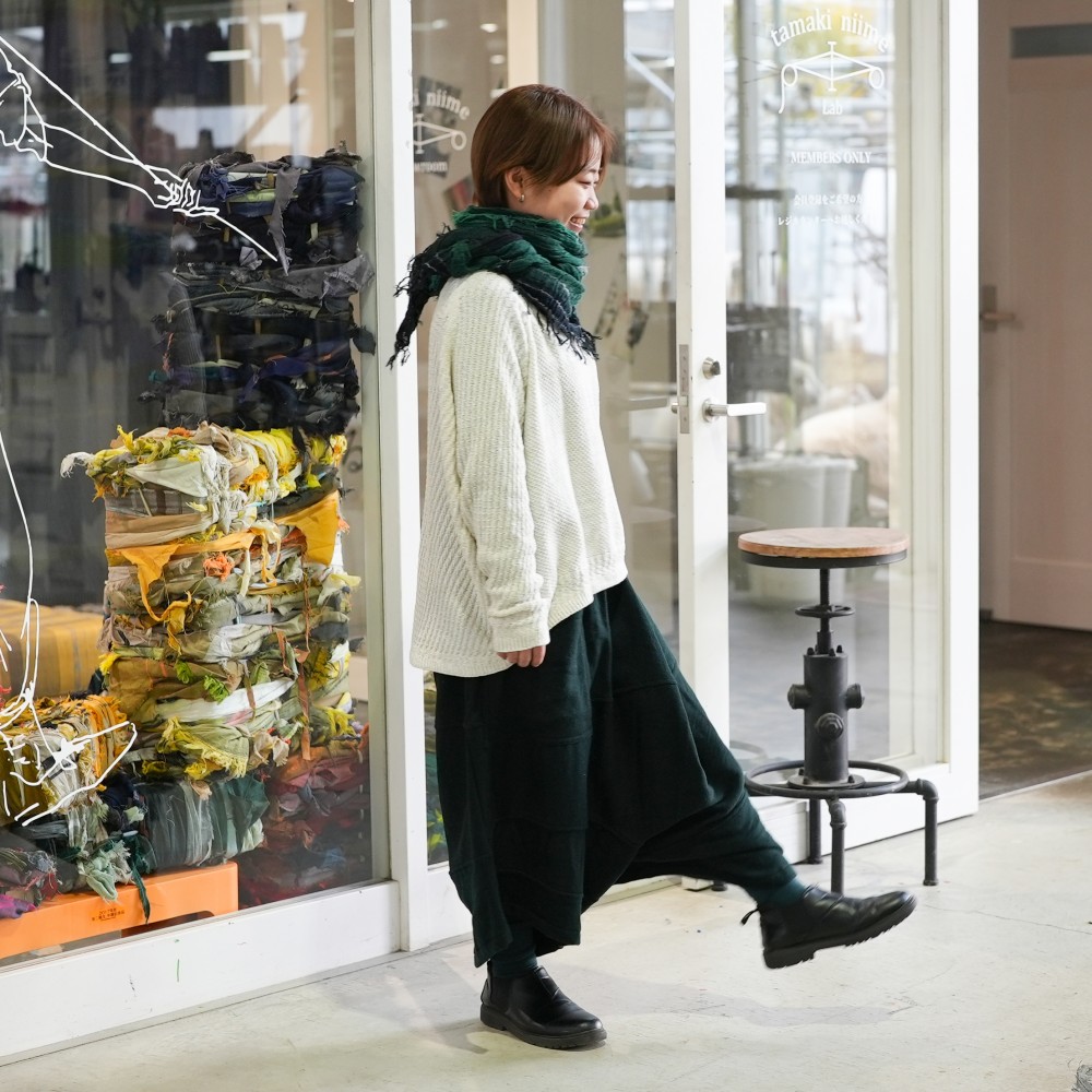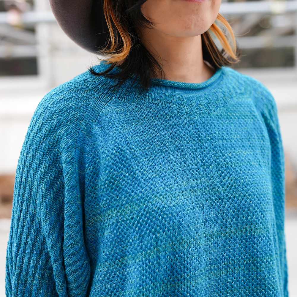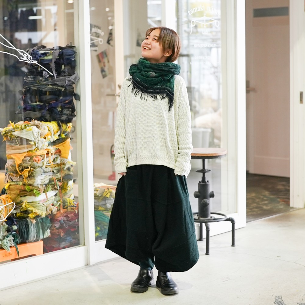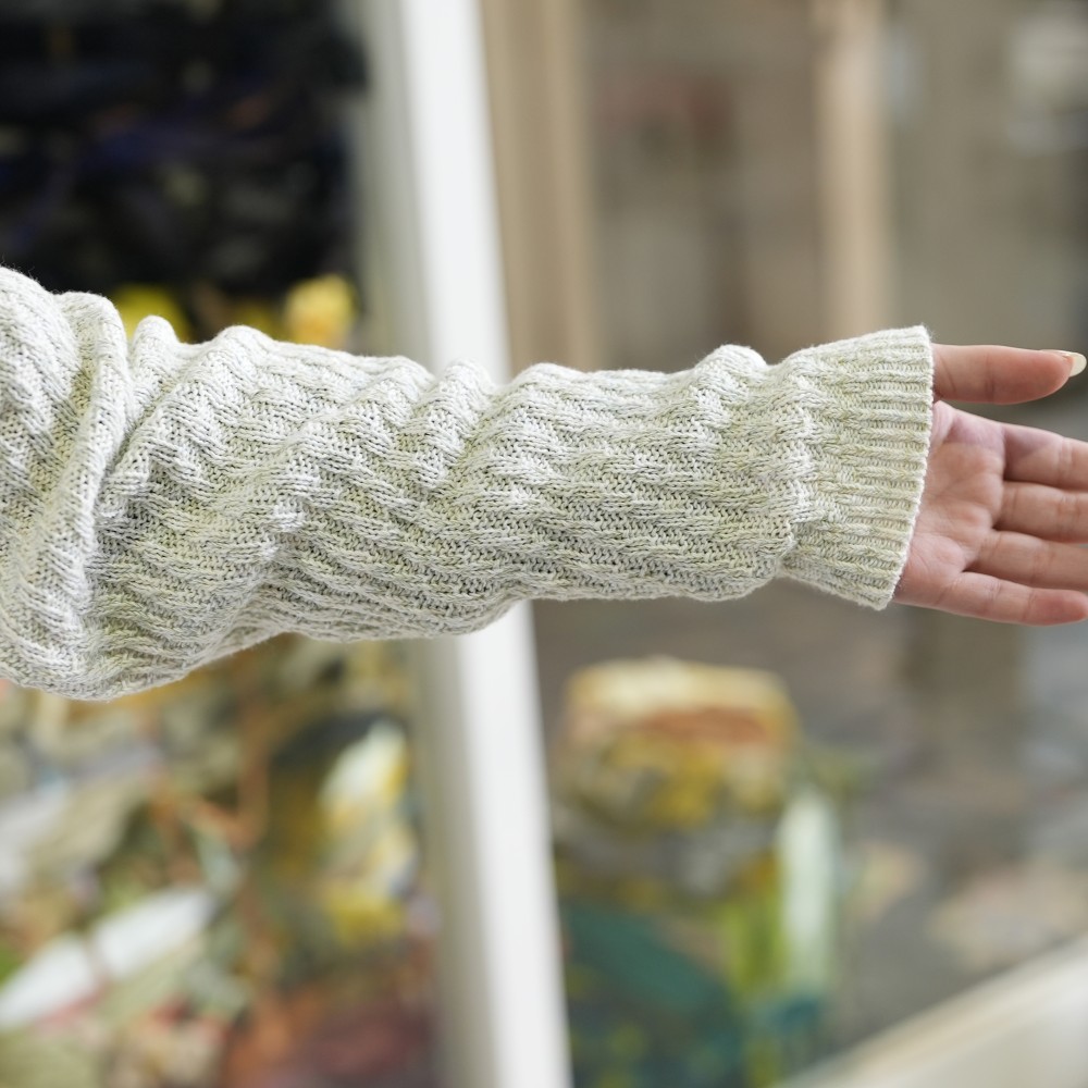 We created ideally by combining a bumpy knitting pattern and a flat knitting pattern.