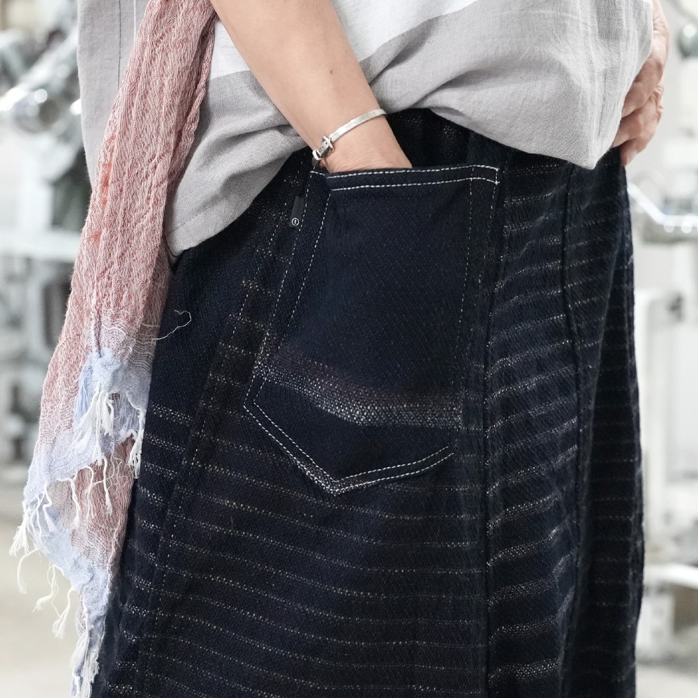 A new frontier of deniime, born by trying plain weave. It looks like there are mountains and valleys on the fabric, so we named it une meaning ridge. If we weave it in one color, you can feel the "ridge" to the touch, and if we use bright colored threads on the lining, the "ridge" will appear. It looks hard, but the back side which touch your skin is soft.