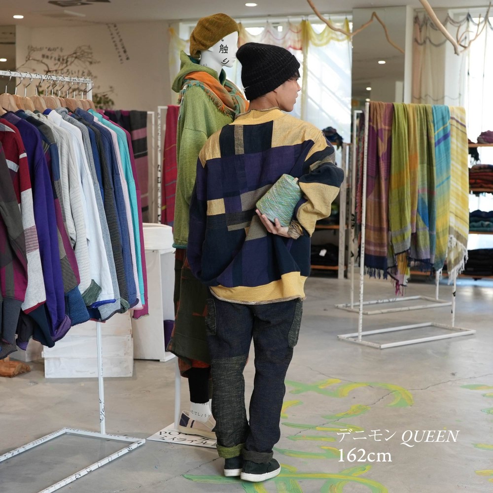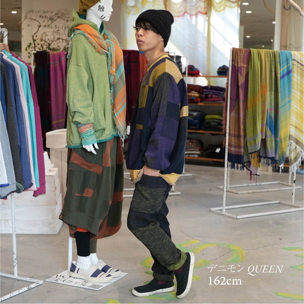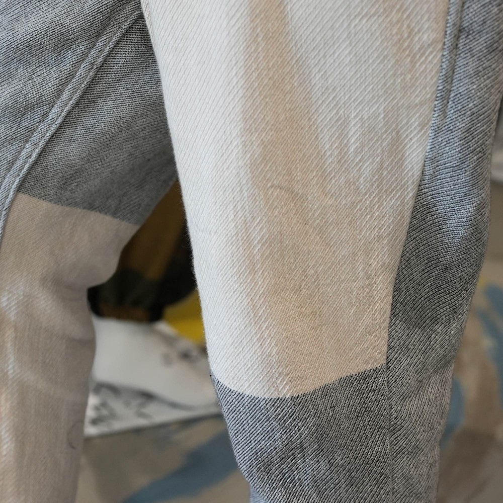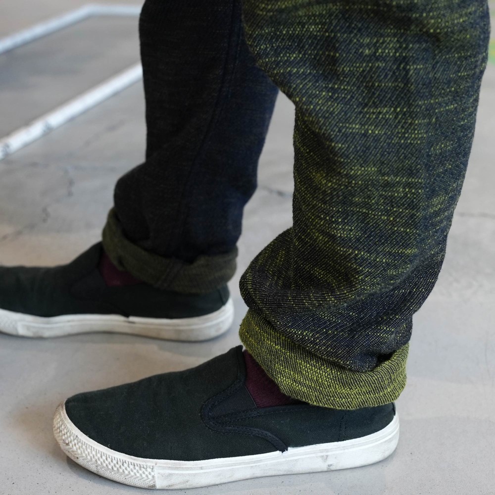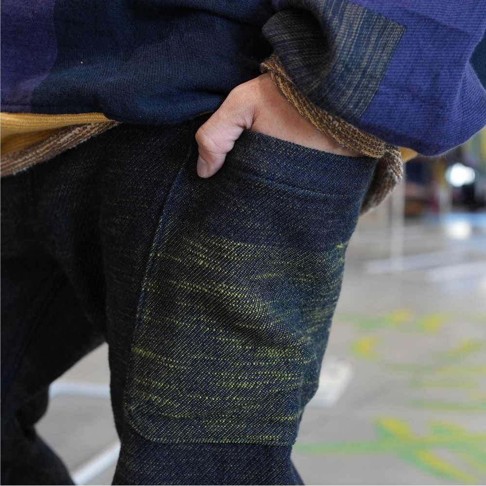 これまでつくりあげてきたデニムの中でも群を抜いて、やわらか。綾織をベースに、色が主役になるように緯糸を表地にがっつりと出しきれいに見える形、大きさ、配置を追及しました。刺し子のような、手仕事感のある色が主役の、デニム。
