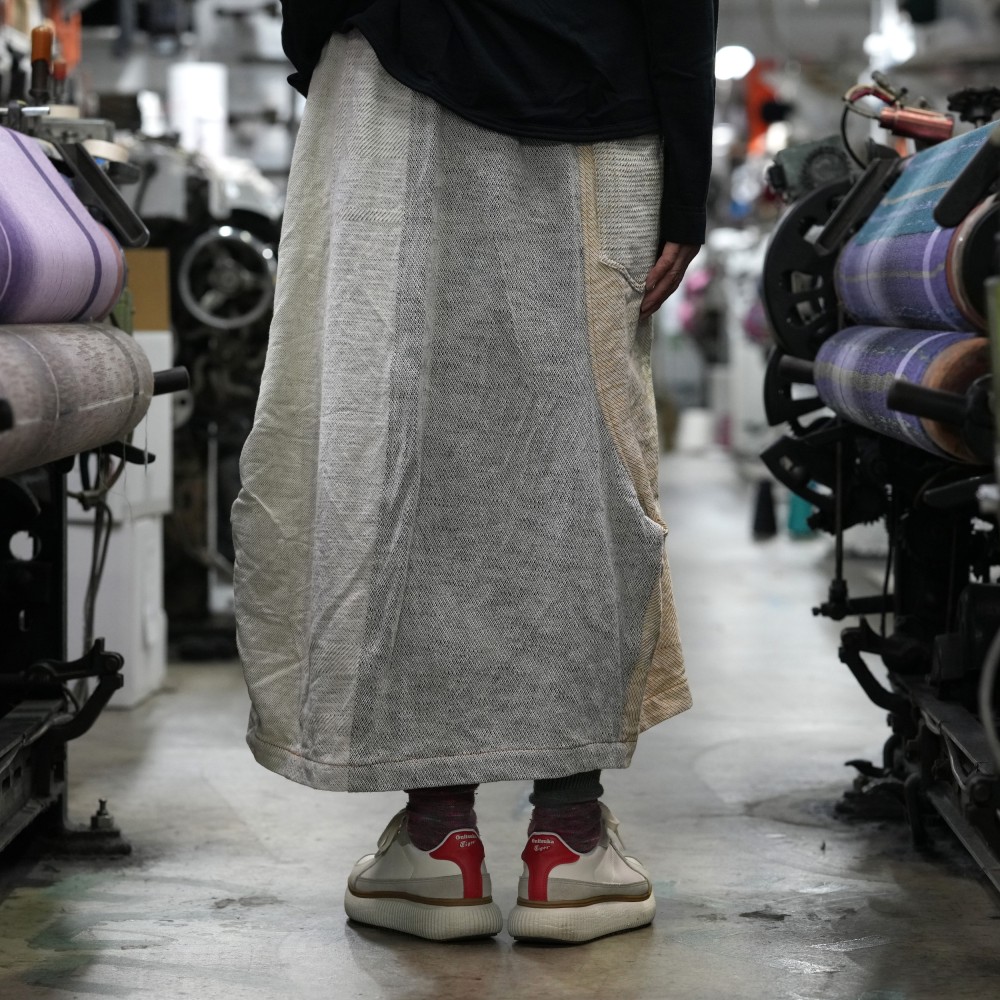 A new frontier of deniime, born by trying plain weave. It looks like there are mountains and valleys on the fabric, so we named it une meaning ridge. If we weave it in one color, you can feel the "ridge" to the touch, and if we use bright colored threads on the lining, the "ridge" will appear. It looks hard, but the back side which touch your skin is soft.