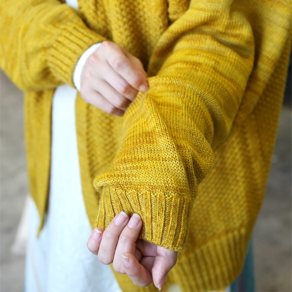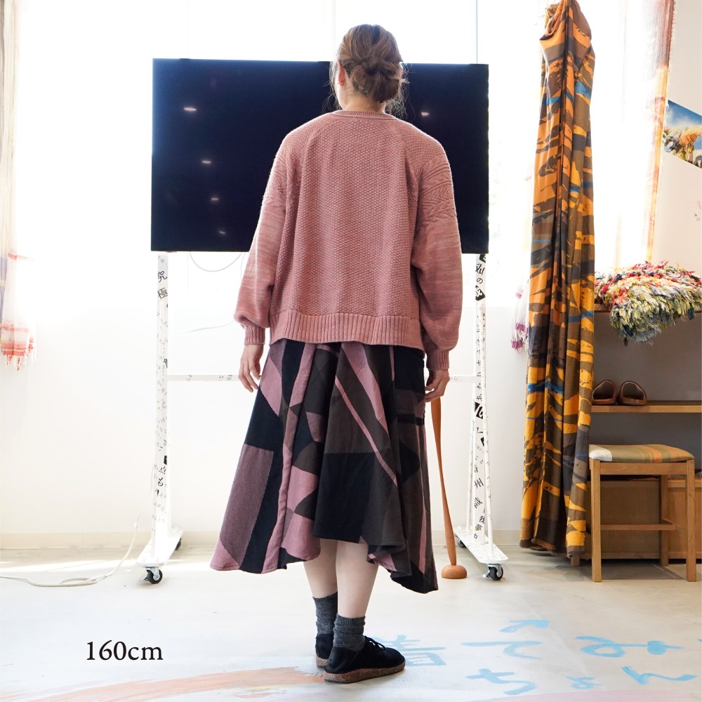 The body and back are knitted in kanoko-knit, and the sleeve pattern is based on the motif of ears of rice in the rice paddies.