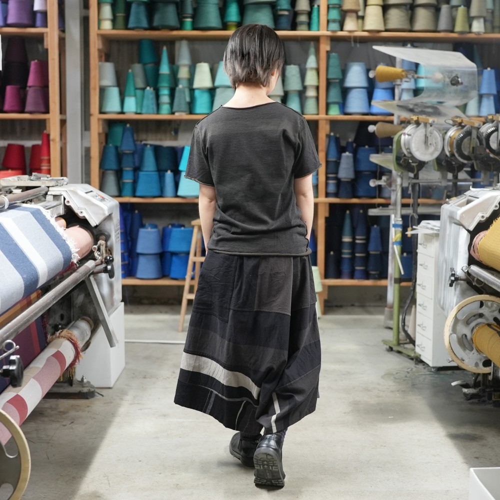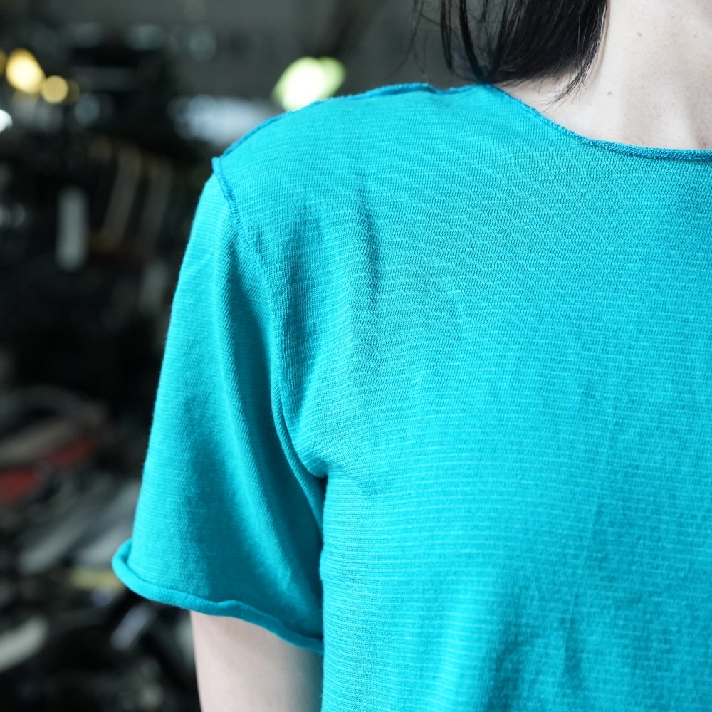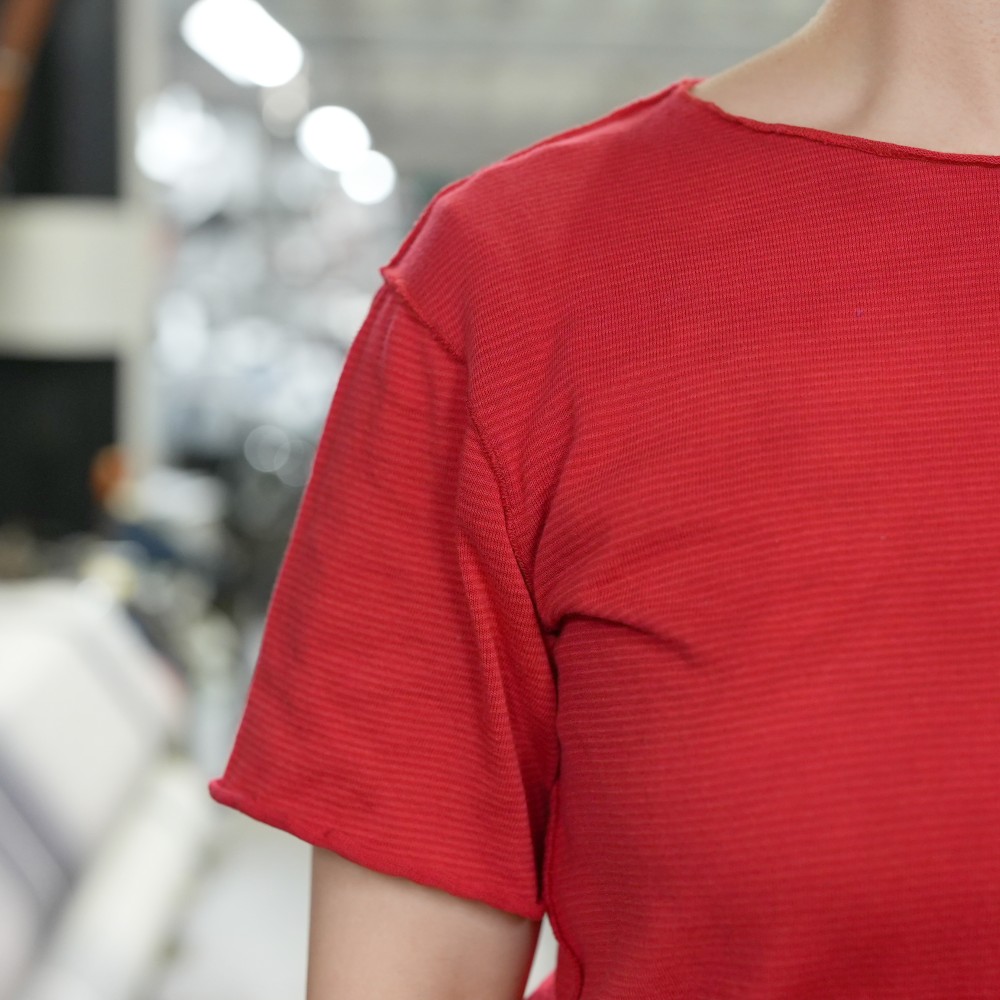 This reversible short-sleeve version of ‘nuime-kuru-hoso’ is created with the same gentle, soft touch as our ‘maru-t,’ slowly knit on a circular knitting machine for exceptional comfort.